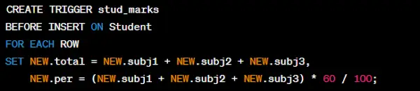 Powyższa instrukcja SQL utworzy wyzwalacz w bazie danych uczniów, w którym za każdym razem, gdy zostaną wprowadzone oceny z przedmiotów, przed wstawieniem tych danych do bazy danych, wyzwalacz obliczy te dwie wartości i wstawi je z wprowadzonymi wartościami. tj.